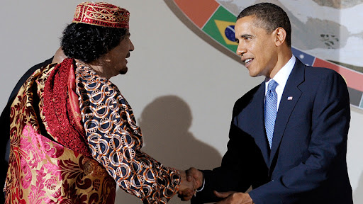 Obama uzstājas savas tautas priekšā un stāsta, ka Lībija pārdzīvojusi savu sāpīgāko vēstures momentu. Interesanti, kāpēc viņš pirms tam, sirsnīgi spiež roku Kadafi kungam (pirmais foto).